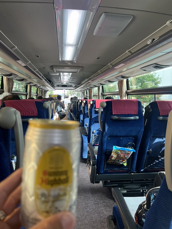 帰りのバスでももちろん、再び缶ビール・ハイボールが登場。
