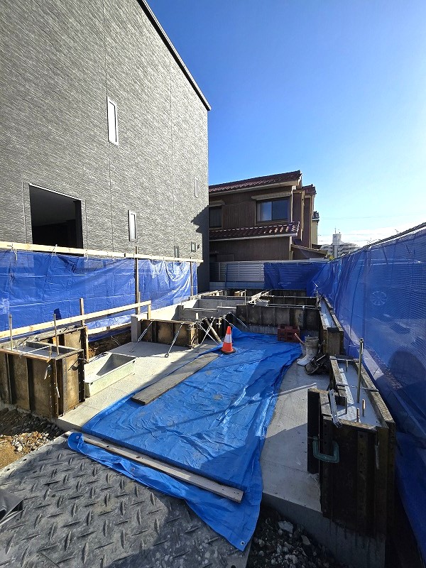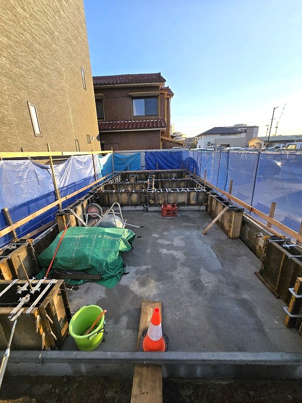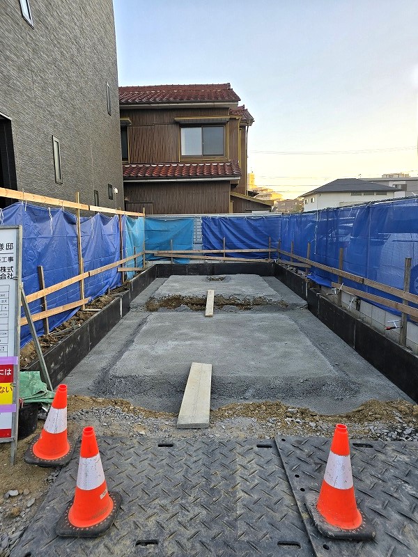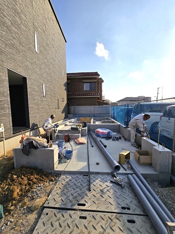 基礎が完成したあとは、外部の配管工事も進められていました。
