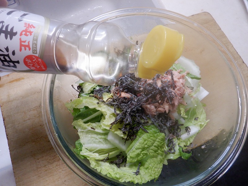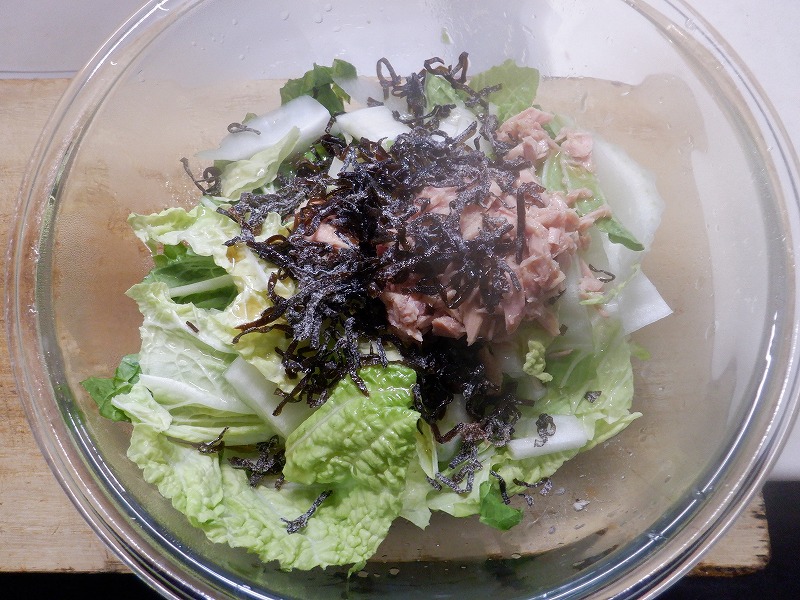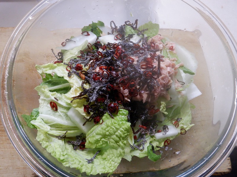 耐熱ボウルに刻んだ白菜をラップで覆い600Wでチン。