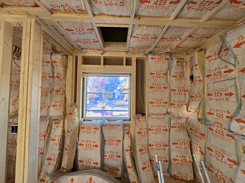 柱の間にふわっとしたものがぎっしり詰め込まれていきます。壁の中に断熱材がきれいに入っていく様子を見ると、目に見えない部分こそ大事に作られているんだな~、と改めて感じますね。