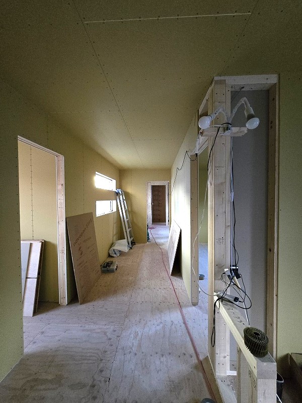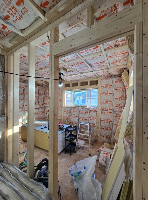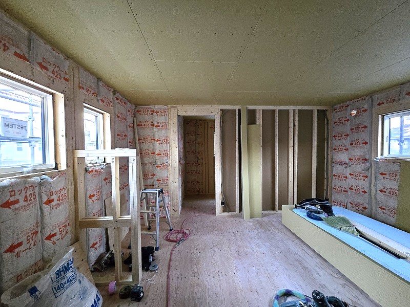 久しぶりに訪れてみると、断熱材もボード貼りもすっかり終わり・・・