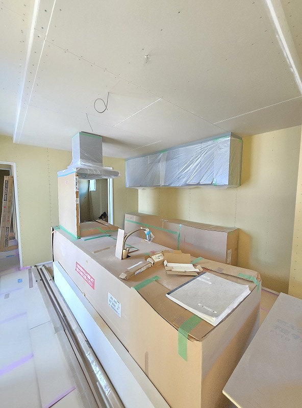 まだ養生されていて全体は見えませんが、キッチンがあるだけで、家の中心がはっきりした気がします。