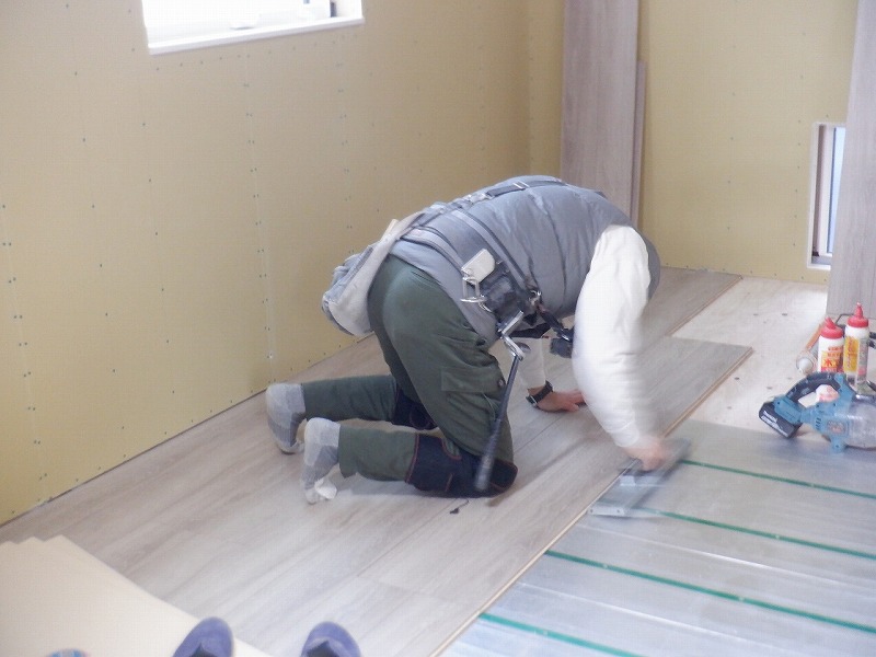前回、現場に行ったときには、2階の床は気づいたらもう張り終わっていましたが、1階の床は、ちょうど張っているところから見ることができました。