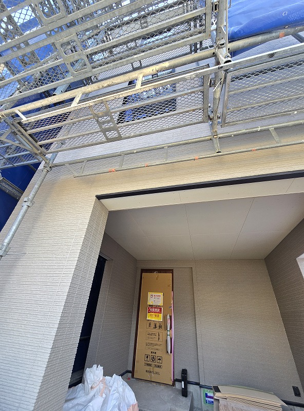 足場に囲まれてはいるものの、サイディングが貼り終わり、建物の外観がしっかり分かる状態に。