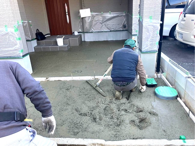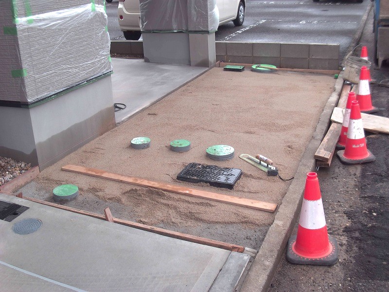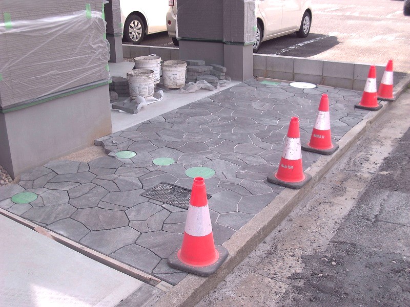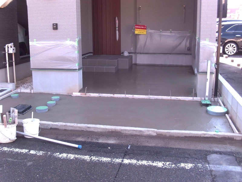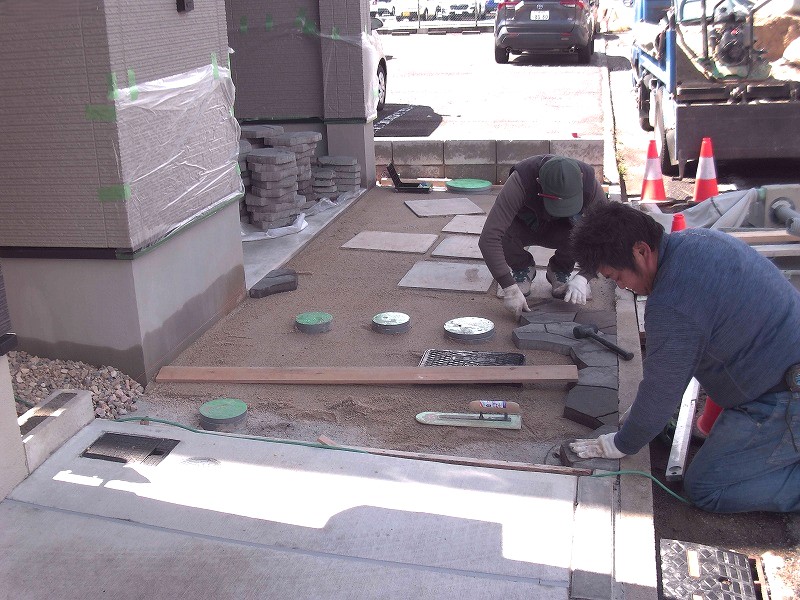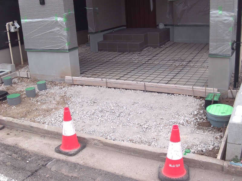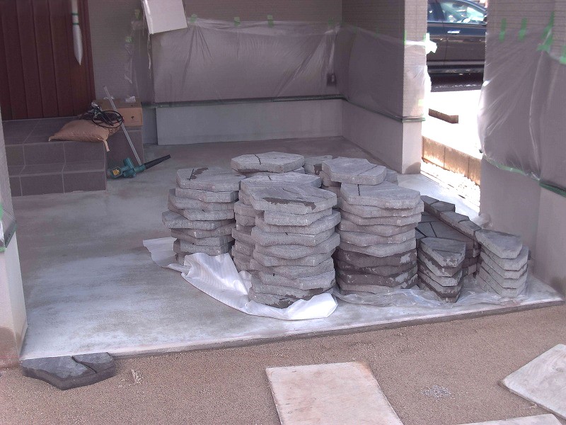 まずは土間コンクリートの施工からスタートし、駐車場部分は平板敷きが行われていました。