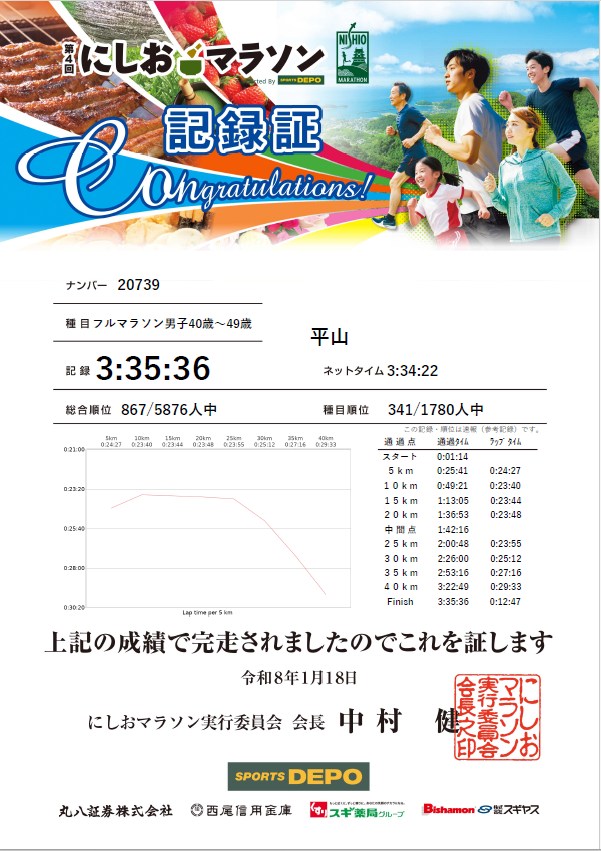 目標を5分ほどクリアできたので満足ではありますが、記録証にも記載がありますが