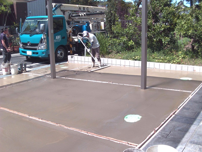鉄のメッシュ筋を組み、土間コンクリートを打っているところ。