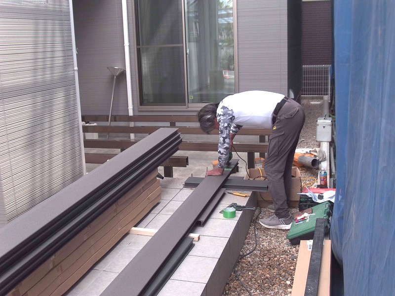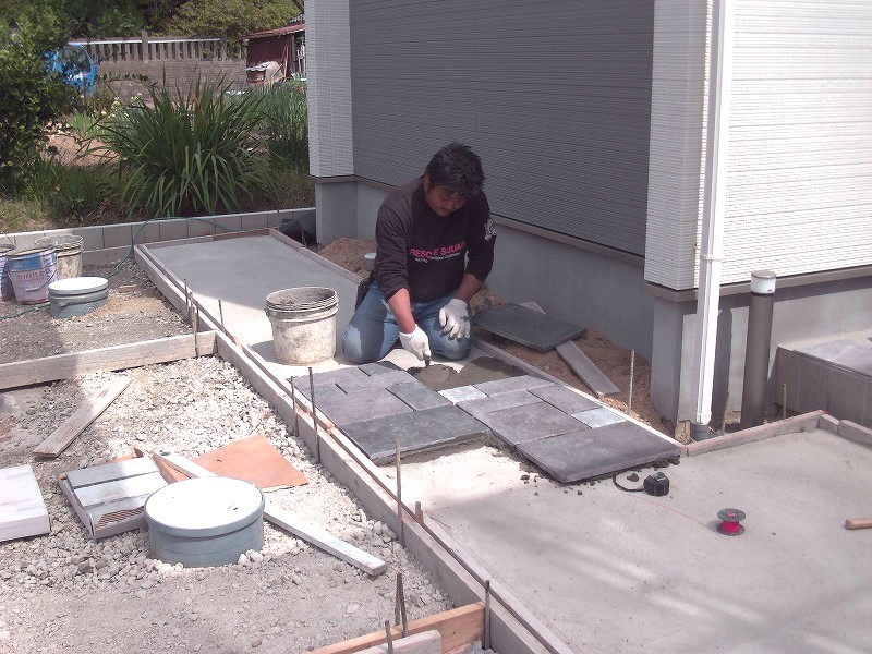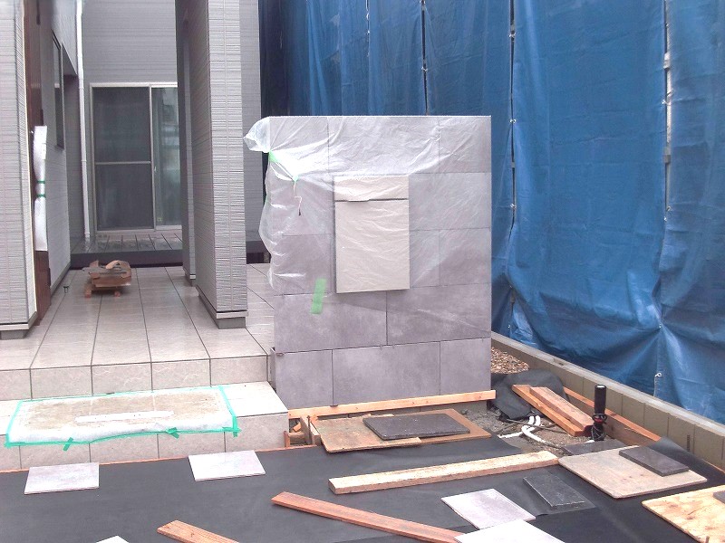 さらに、カーポートやウッドデッキの組立、門壁のタイル張りや平板敷きも進行中。
