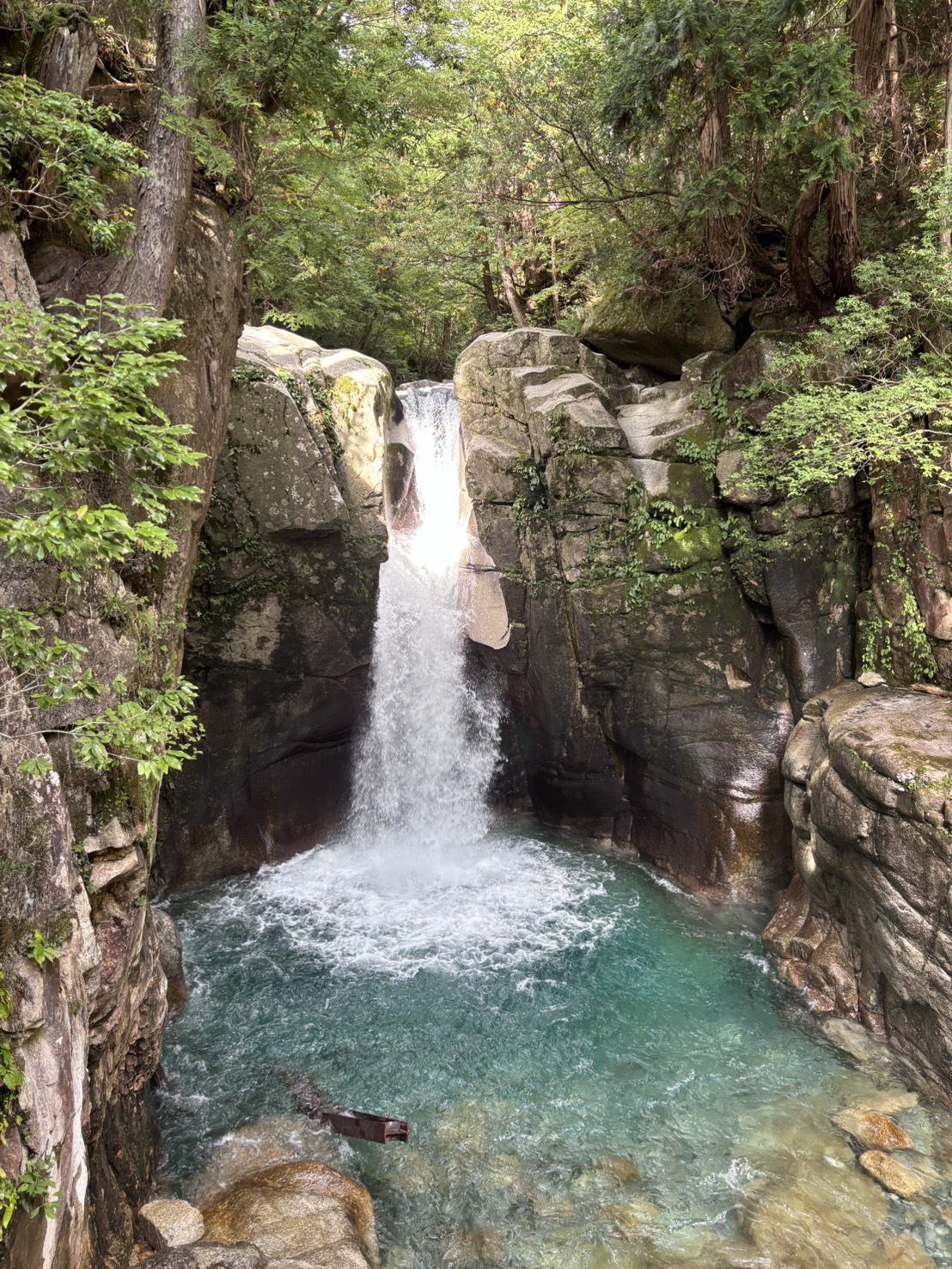 岩の間を勢いよく流れ落ちる滝の水は透明度が高く、見ているだけで涼しさを感じます。