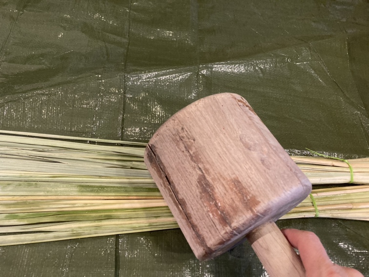 マコモの束を3つに分けて、霧吹きで濡らし、木槌でたたいて柔らかくして右巻きにネジネジして