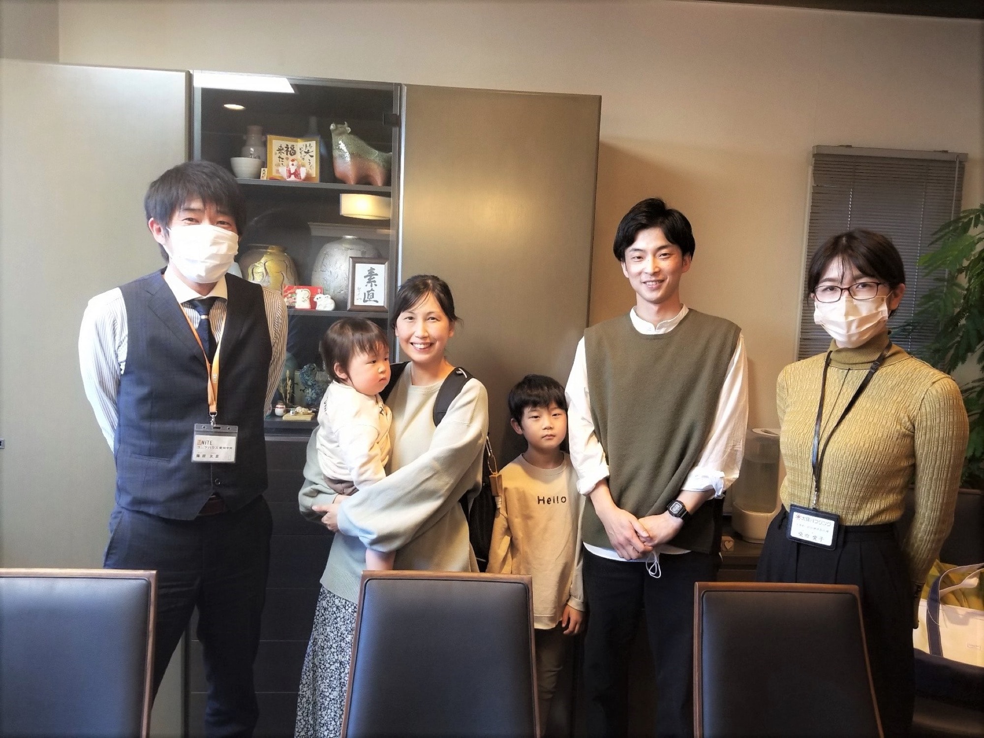 今回密着させていただくのは春日井市でお家を建てられるSさま。ご夫婦にお子さま2名というご家族構成です。こちらは先日の顔合わせのときに撮影した記念写真です。ご夫婦の笑顔から、新居への期待が感じられます。