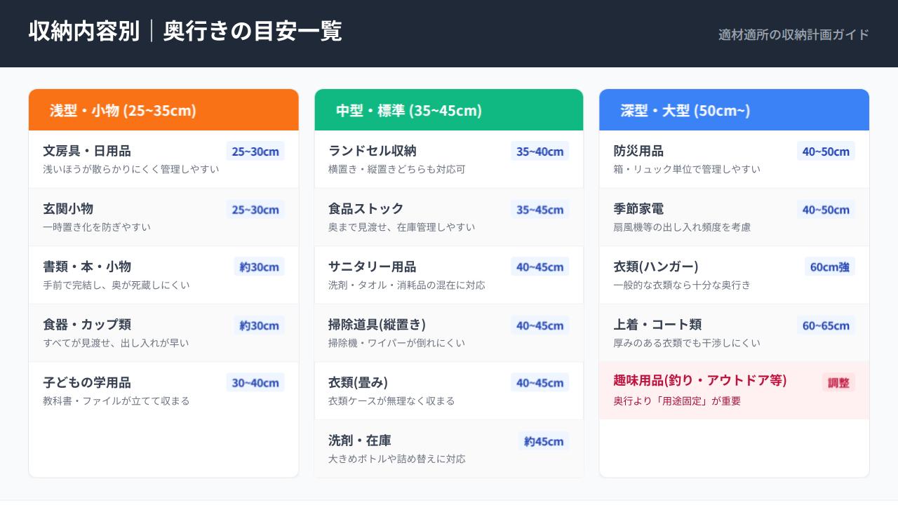 | 趣味用品(アウトドア・釣り・DIY等) | 内容により調整 | 奥行より「用途固定」が重要 |