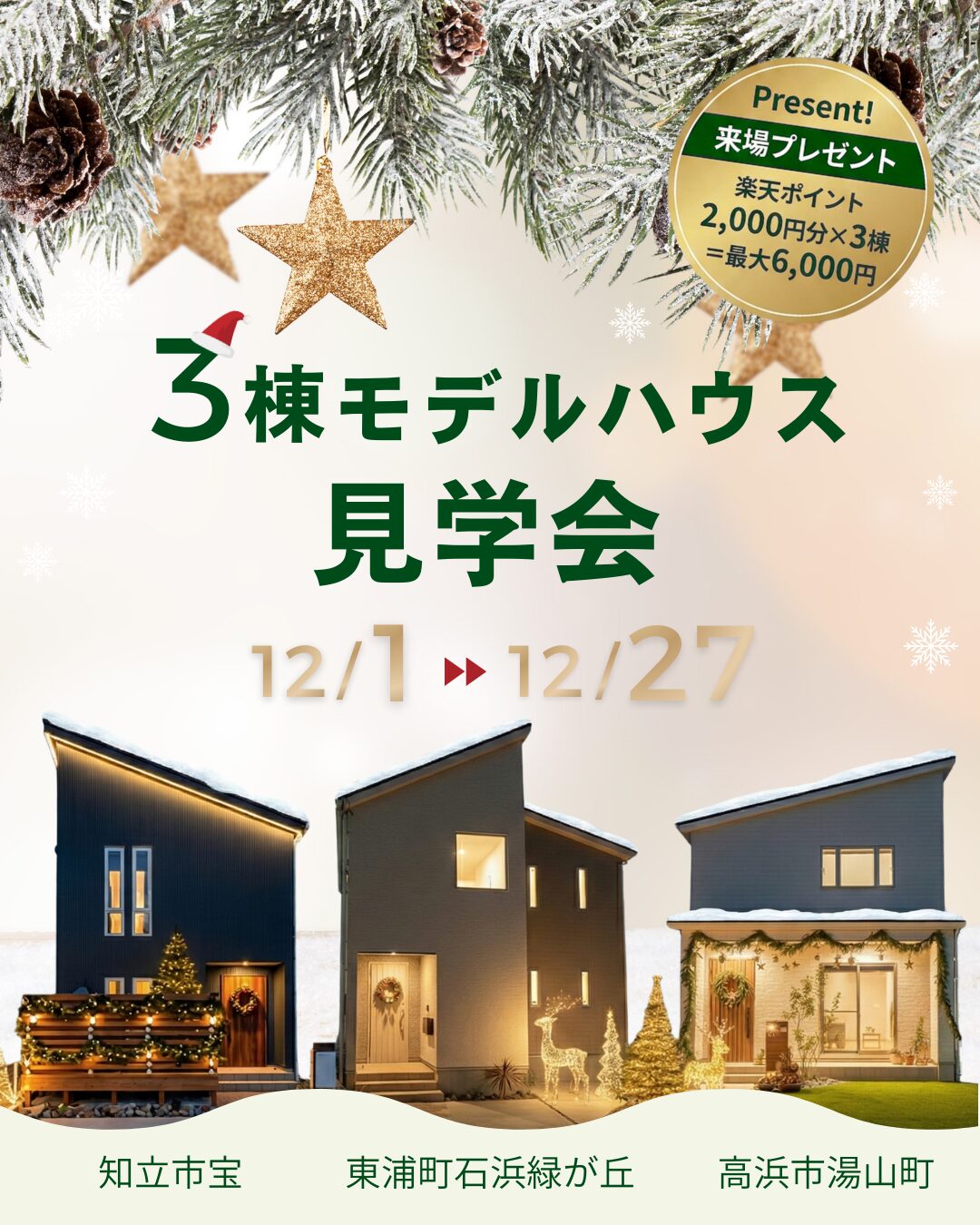 12月1日(月)~27日(土)までの期間限定、モデルハウス3棟(@高浜市・知立市・東浦町)見学会開催。安心構造・最新設備 見て、感じて、あなたの理想のスタイルをイメージしてください。
