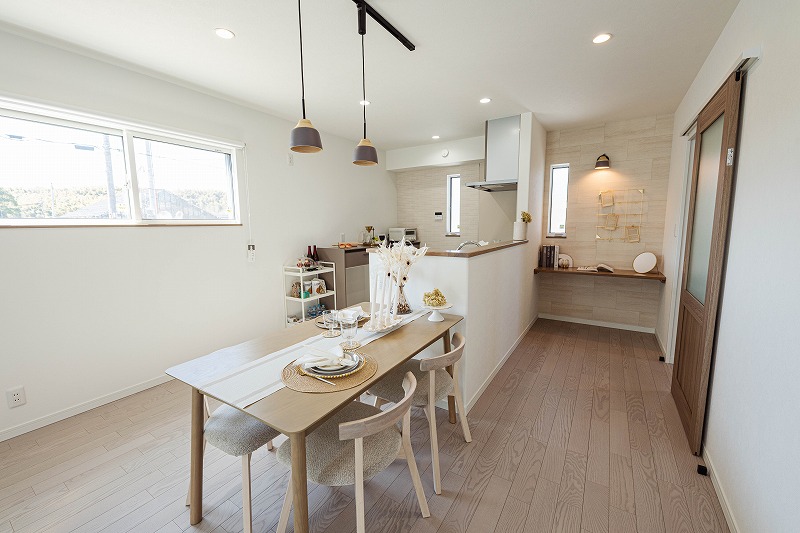 キッチンとダイニングを横並びに配置し、食事の準備や後片付けがスムーズに行うための理想的な動線設計。