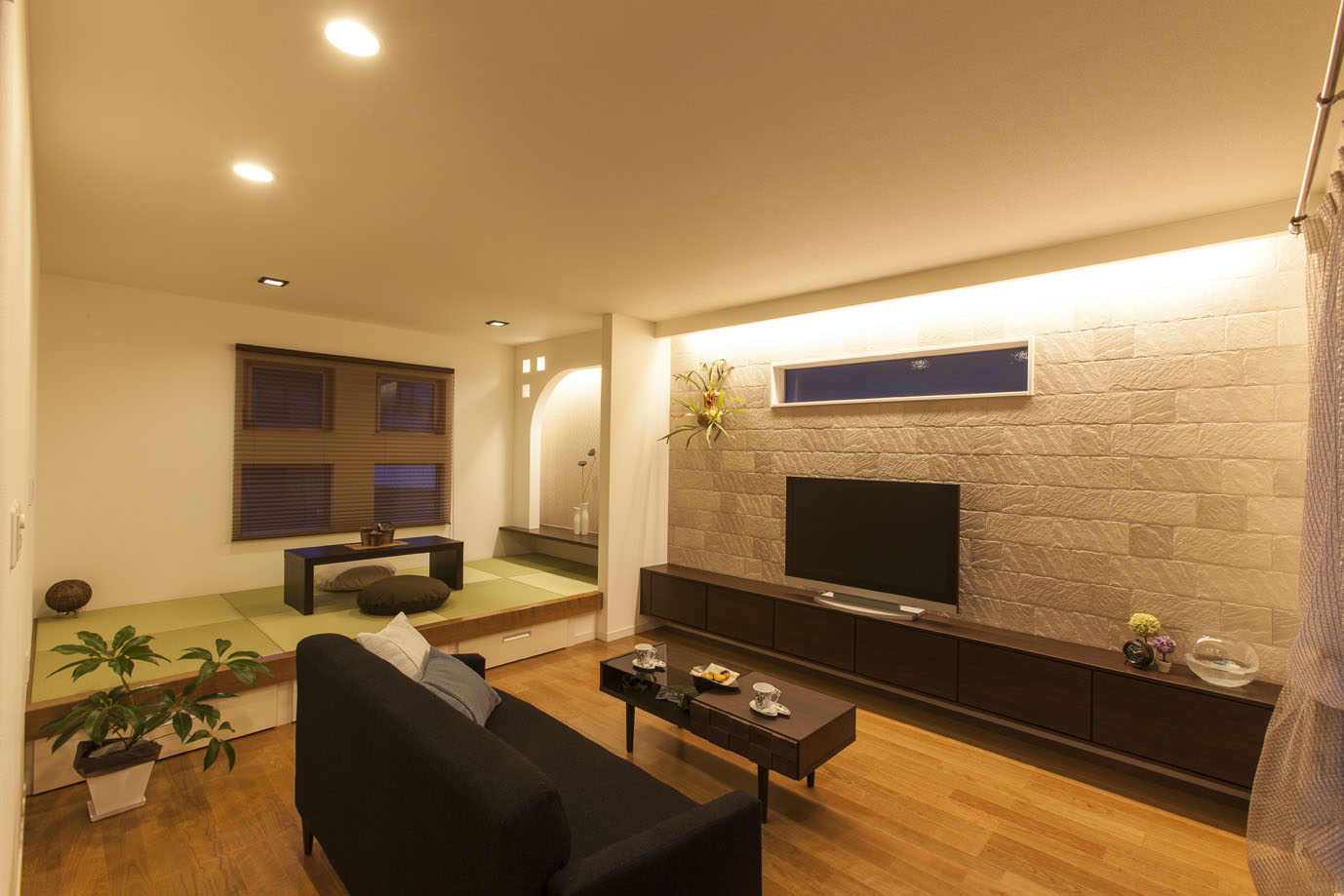 リビング横に畳スペースを設けて変化のある空間に。段差の下を収納として有効利用。