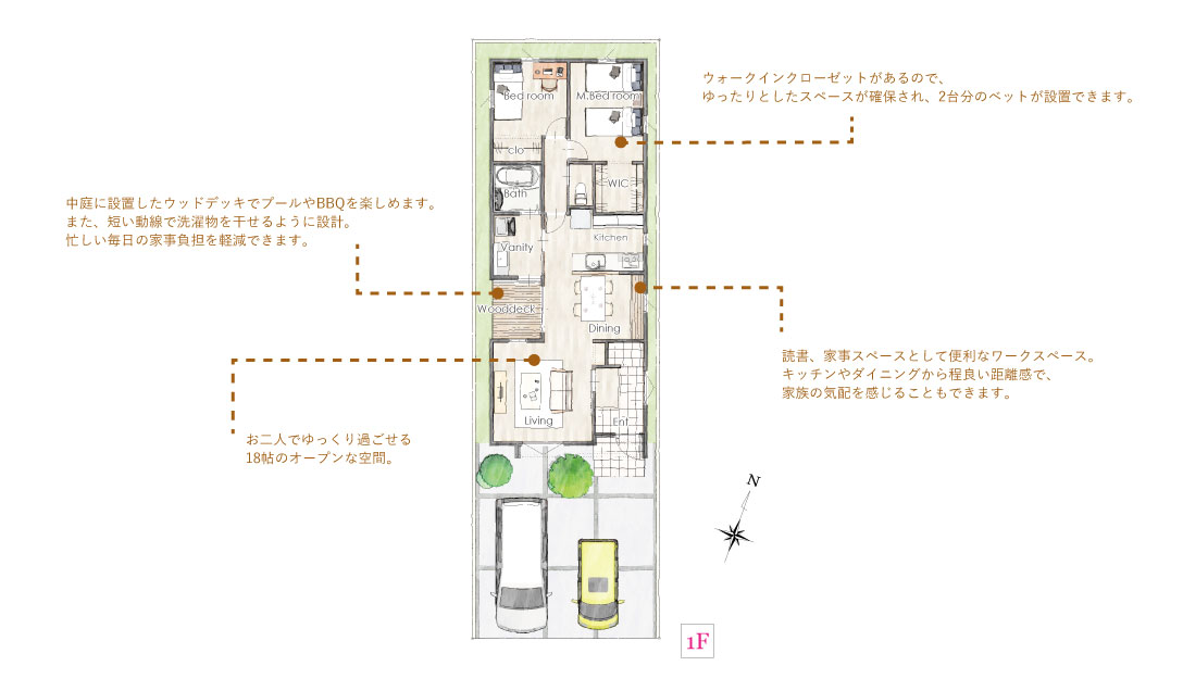 住まいの中心にはウッドデッキ付きの中庭を配置。洗濯動線を考慮し、物干しもスムーズ。天気の良い日には、ウッドデッキでのんびりティータイムや軽いアウトドア気分も楽しめます。