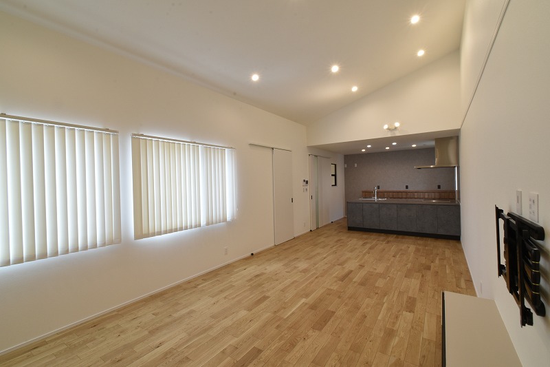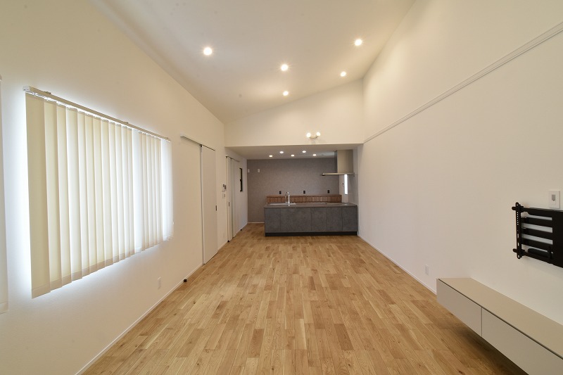 勾配天井の高いリビングは、自然光がたっぷりと差し込み、家族がのびのびと過ごせる開放的な空間に。